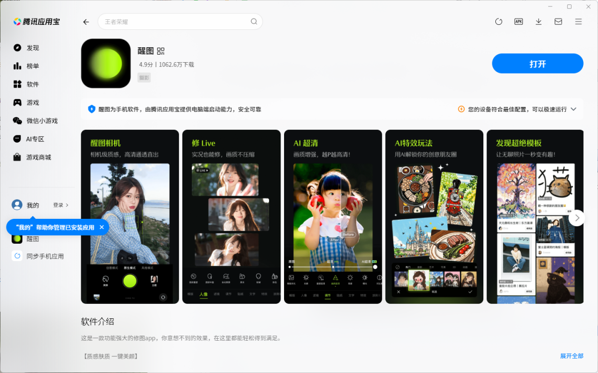 在酷软下载站下载最新安装包,按提示先安装应用宝电脑版(已安装会直接调用打开,未安装应用宝时,手机APP无法独立在电脑上运行),然后在应用宝里安装醒图,安装好后,直接打开登录就能玩了。